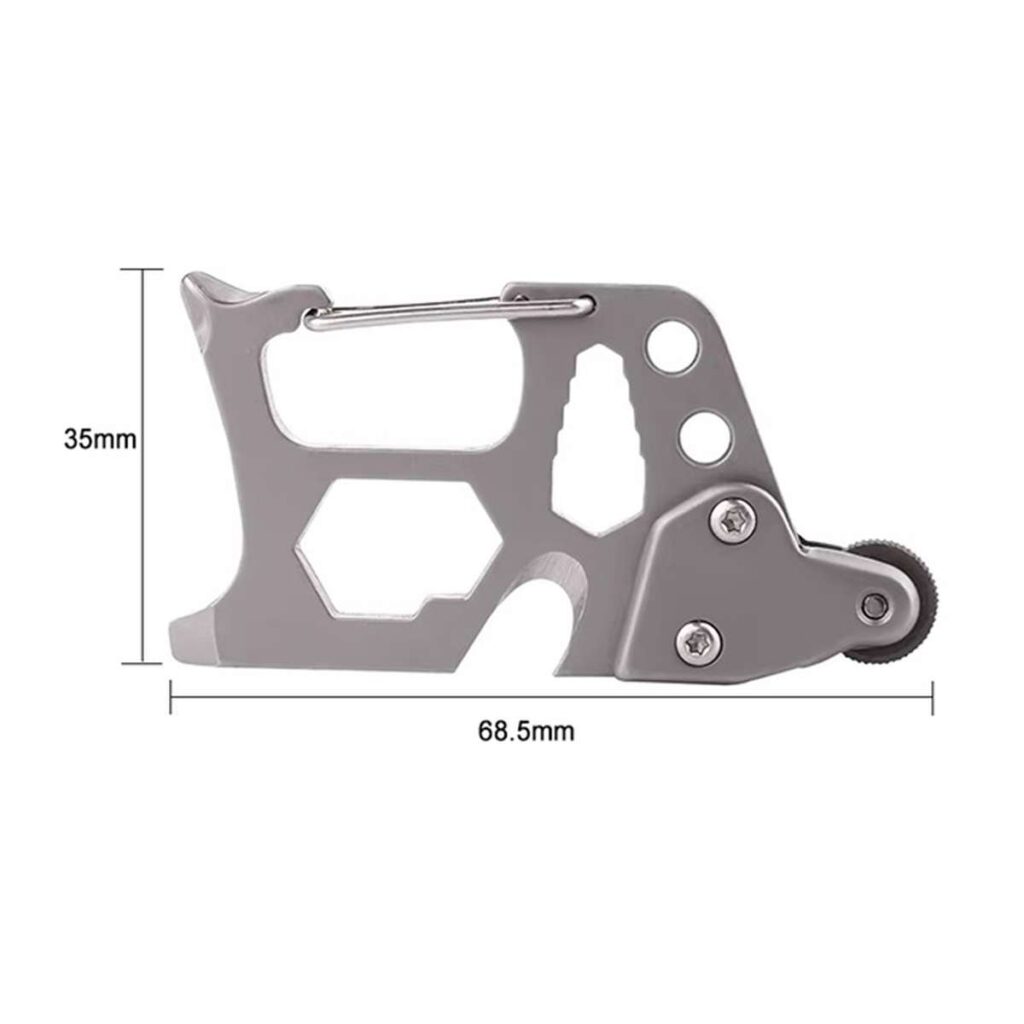 Multifunctionalul are doua gauri pentru a fi prins ca si breloc, plus o carabiniera de prindere cu arc puternic. Este confectionat din otel inoxidabil rezistent.